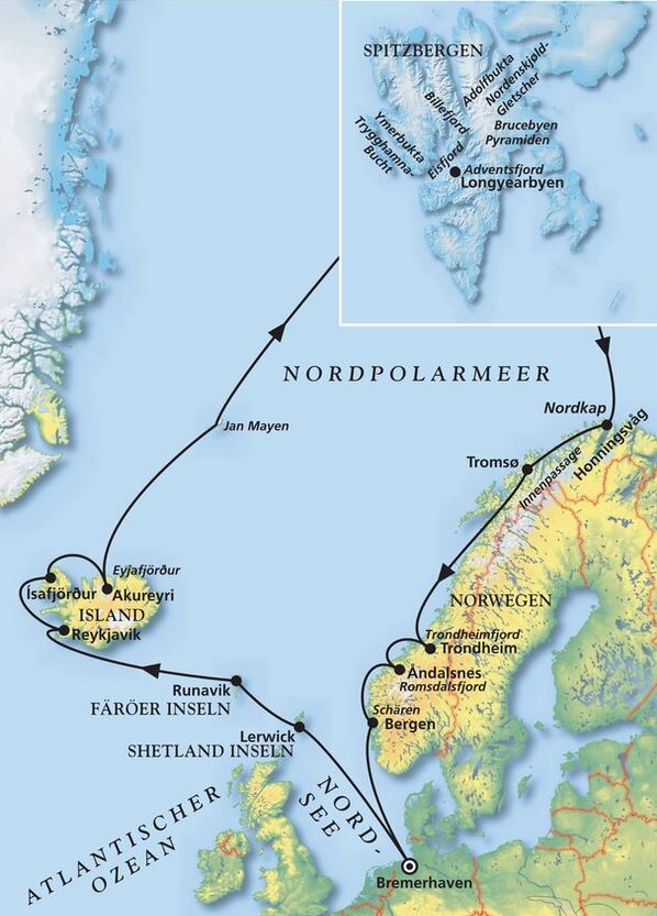 Bremerhaven - Lerwick - Runavik - Reykjavik - Ísafjörður - Akureyri - Spitzbergen - Honningsvåg (Nordkap) - Tromsø - Trondheim - Bergen - Bremerhaven